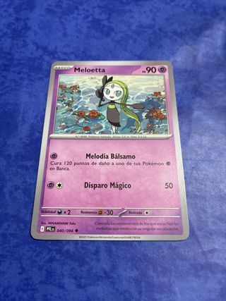Carta Pokémon de Meloetta, edición básica. - Número de carta: 040/094. - Ilustrador: MINAMINAMI Toke. - PS: 90. - Ataque: Melodía Bálsamo (Cura 120 puntos de daño). - Ataque: Disparo Mágico (50). - Debilidad: x2. - Resistencia: -30. - Retirada: 1. - Año de publicación: 2025.