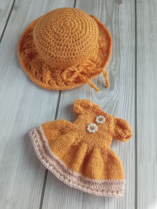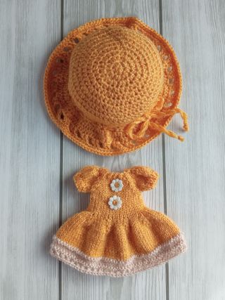 Conjunto de dos piezas compuesto por una pamela y un vestido en amarillo mostaza, para muñeca Blythe o similar. El vestido de estilo veraniego y manga corta, incluye dos margaritas centrales de adorno. En su filo lleva un bonito calado en marrón claro. Se le incluye tres pequeños broches traseros. La pamela de filo calado y ondulado, incluye un cordón del mismo color bordeándolo, concluyendo en un lazo lateral. Confeccionada de una sola pieza, se amolda perfectamente a la cabeza de la muñeca. El precio del conjunto es 25€. Se aceptan también envíos por carta ordinaria o certificada (gastos extra al precio de la publicación).