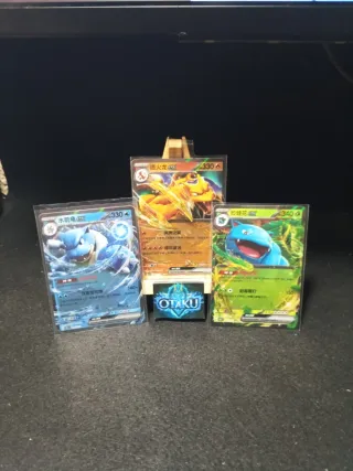Trío de cartas Pokémon: Venusaur, Blastoise, Chari