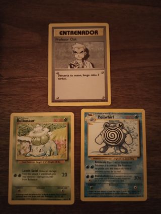 Cartas Pokémon: .Bulbasaur .Entrenador Profesor Oak .Poliwhirl Muy buen estado. De mi propia colección. Siempre bien cuidadas. Pokémon ! Hazte con todos! Trato en mano zona de Barcelona. No envíos,no bizum.