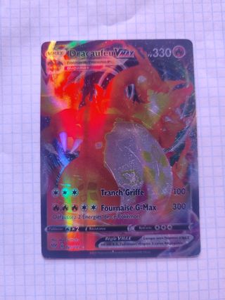 Carta de Charizard VMAX de Pokémon. En frances - Ataque Tranch'Griffe con 100 de daño. - Ataque Fournaise G-Max con 300 de daño. - Regla VMAX: Al ser puesto K.O., el oponente recupera 3 cartas Recompensa. - Ilustración de aky CG Works.