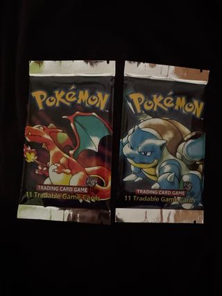 Dos sobres de cartas coleccionables de Pokémon. - Cada sobre contiene 11 cartas. - Ilustraciones de Charizard y Blastoise.