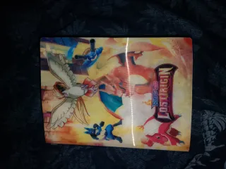 Carta coleccionable de Pokémon de la expansión Espada y Escudo: Origen Perdido. Presenta ilustraciones de varios Pokémon. - Ilustración de Pidgeot. - Ilustración de Charizard. - Ilustración de Lucario. - Ilustración de Charmander. - Ilustración de Blastoise.