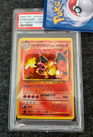 Carta coleccionable de Charizard del set Base de Pokémon, edición japonesa de 1996. La carta ha sido graduada por CGC con un puntaje de 4 (VG/EX) y es la versión Holo. - Pokémon: Charizard - Año: 1996 - Edición: Base Set (Japonesa) - Graduación: CGC 4 (VG/EX) - Tipo: Holo
