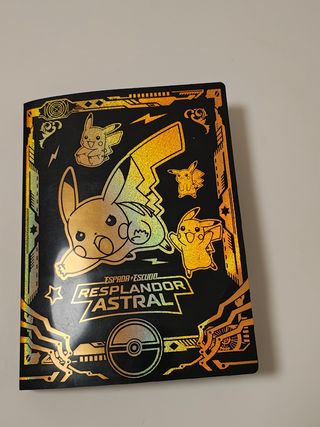 Carpeta de colección Pokémon. Ideal para proteger tus cartas. Diseño elegante y llamativo con detalles dorados. - Incluye 1 carpeta con diseño de Pikachu y detalles del juego Pokémon Resplandor Astral. - Presenta un diseño brillante y en relieve. - Perfecta para coleccionistas. Las cartas son imitaciones.