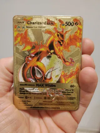 Carta metálica dorada de Charizard DX. - Diseño especial con acabado metálico. - Ilustración de Charizard en modo MAX Wildfire. - HP 500.