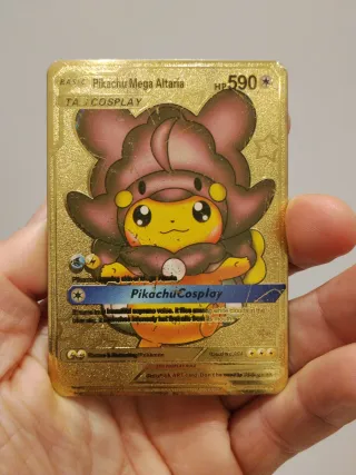 Carta metálica dorada de Pikachu Mega Altaria. - Diseño especial Tag Cosplay. - HP 590. - Número de carta: 004.