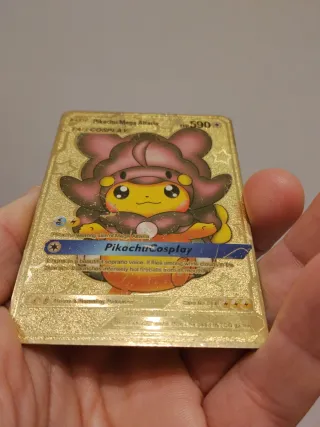 Carta coleccionable de Pokémon con acabado metálico dorado. Presenta un diseño especial de Tag Cosplay. - Diseño de Pikachu con traje de Ampharos. - Acabado metálico dorado. - Texto en inglés.