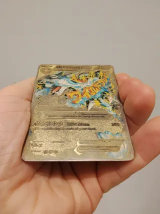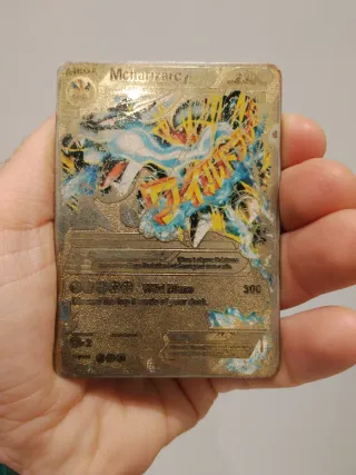 Carta Pokémon Mcharizard EX con acabado metálico dorado. - Diseño de Mcharizard EX. - Acabado metálico dorado.
