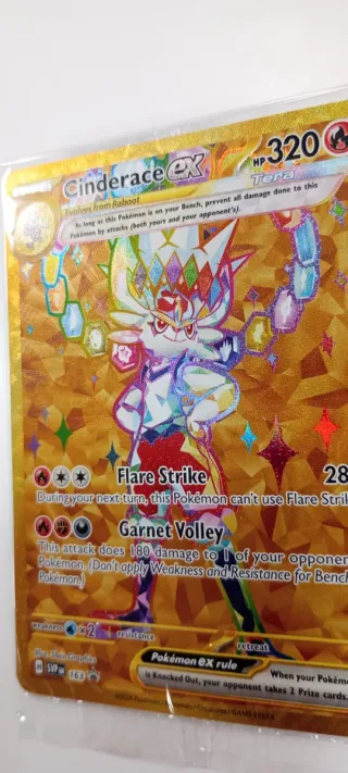 Carta Pokémon Cinderace EX dorada, con arte especial. - Etapa: Stage 2 - HP: 320 - Ataques: Flare Strike, Garnet Volley - Ilustrador: Sban Graphics - Código: SVP EN 163