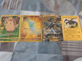 Lote de 4 cartas Pokémon de edición especial en acabado dorado. Precio unidad, 3€ - Carta Pokémon Pikachu. - Carta Pokémon Mew. - Carta Pokémon Zekrom. - Carta Pokémon Shining Charizard.