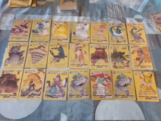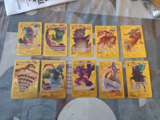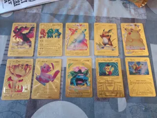 Colección de cartas Pokémon con acabado dorado brillante. Incluye varios Pokémon populares. Precio unidad 3_€ - Diseño metálico y llamativo. - Ideal para coleccionistas.