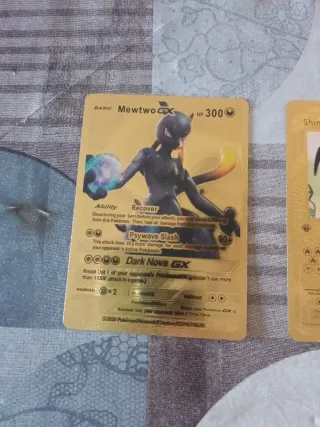 Carta Pokémon Mewtwo GX con acabado dorado. Cartas raras, no son de metal. Hago envío, precio negociable por las dos. - Tipo: Básico - HP: 300 - Habilidad: Recover - Ataques: Psywave Slash, Dark Nova GX - Debilidad: x2 - Resistencia: Ninguna - Retirada: 2