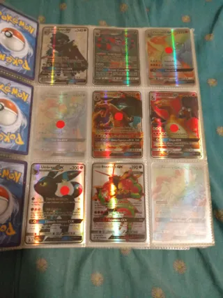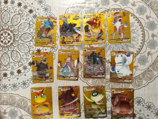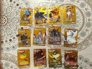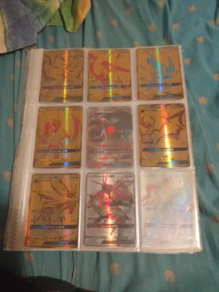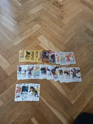 Colección de cartas Pokémon de Charizard con acabado dorado. - Incluye varias versiones de Charizard V, VMAX y GX. - Cartas con arte brillante y detalles metálicos. - Ideal para coleccionistas. -Cada carta 1'5€ Hay alguna en peor estado.