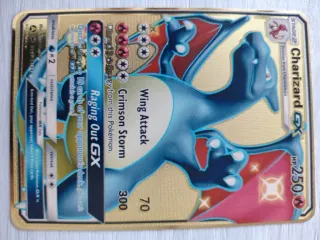Carta Pokémon Charizard GX con un acabado metalizado dorado. - Ataque: Wing Attack (70) - Ataque GX: Raging Out GX - HP: 250 - Debilidad: x2 - Resistencia: - - Retirada: 2
