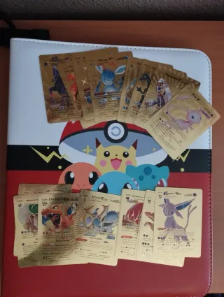 Colección de cartas Pokémon doradas, incluyendo un álbum. - Cartas con acabado dorado brillante. - Diseños de Pokémon populares como Mew, Charizard, Glaceon, Espeon, Arceus y más. - Incluye álbum para guardarlas.