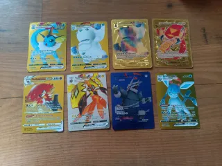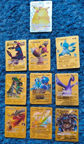 Conjunto de cartas Pokémon con acabado dorado brillante. Cada carta presenta un diseño único y llamativo. Precio x cada carta. - Cartas con arte especial. - Acabado metálico dorado. - Diseños variados de Pokémon.