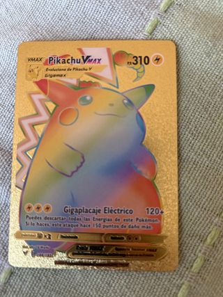 Carta coleccionable de Pikachu VMAX Gigamax con acabado dorado y diseño arcoíris. - Tipo: Eléctrico - PS: 310 - Ataque: Gigaplacaje Eléctrico (120+) - Evolución de Pikachu V
