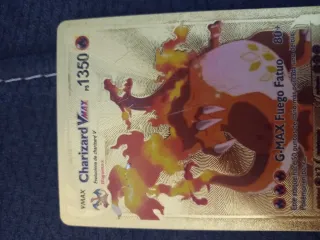 Carta Pokémon dorada de Charizard G-MAX Fuego Fatuo. Escucho ofertad - Ataque: G-MAX Fuego Fatuo 80+ - HP: 1350 - Número de carta: 143/293
