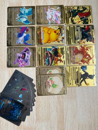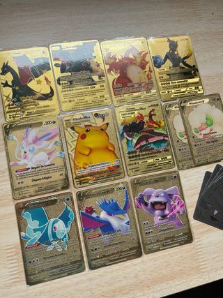 Se venden 22 cartas Pokémon, 12 doradas y 10 plateadas.Están en muy buen estado. - Incluye cartas brillantes de diferentes Pokémon. - Son cartas de diferentes ediciones. - Perfecto estado - todas estan sin uso, hay dos cartas (SYLVEONV y LUMINEON V) que en la parte trasera de la carta tienen un pequeño desgaste por mal almacenaje (lo muestro en fotos individuales en la publicacion). el resto esta en perfecto estado.