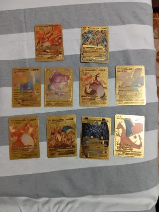 Colección de cartas Pokémon doradas metálicas. Muy bonitas para colección o decoración. Incluye varias cartas populares como Charizard, Mewtwo, Blastoise y más. Estado muy bueno. Se venden todas juntas. Precio: 19€