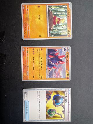Lote de 3 cartas Pokémon. - Carta 1: エネルギー回収 (Energy Retrieval) - Carta de Entrenador (Trainer) - 079/086 - Carta 2: コジョフー (Cofagrigus) - 049/086 - Carta 3: ギガイアス (Gigalith) - 045/086