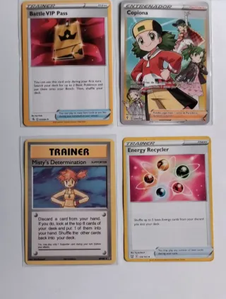 Conjunto de cuatro cartas de Pokémon. - Battle VIP Pass (Item) - Copiona (Entrenador) - Misty's Determination (Supporter) - Energy Recycler (Item)