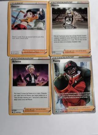 Conjunto de 4 cartas de Entrenador Pokémon. - Carta Dancer. - Carta Morris. - Carta Ariette. - Carta Peony.