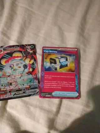 Se venden dos cartas de Pokémon: Orbeetle VMAX y Caja Secreta. - Carta Orbeetle VMAX con 310 HP. - Carta de Entrenador Caja Secreta.