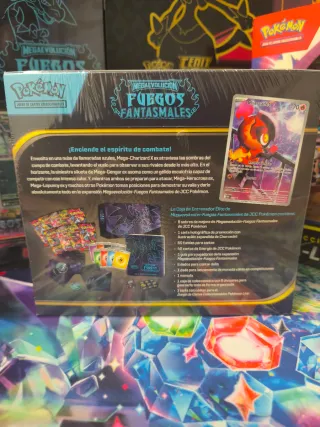 Caja de Entrenador Élite de Pokémon con temática de Fuego Fantasmal. - Ilustración de Charizard. - Diseño con temática de Megaevolución. - Incluye contenido para el juego de cartas coleccionables Pokémon. -Idioma: Español.