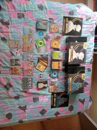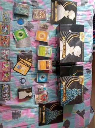 -cartas ex -cartas holo - cartas revers más de 40 - códigos más de 50 -cartas normales más de 200 -cartas de objetos y entrenadores - se acepta cambio por cartas megaevolucion y llama blanca - si quieres comprar preguntar precio