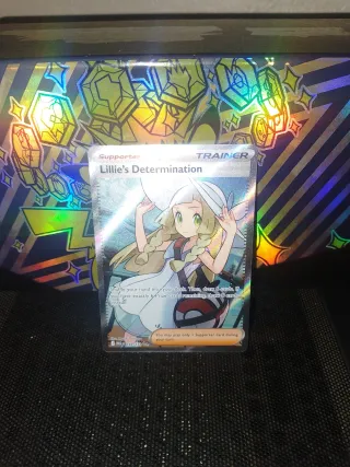 Carta de Entrenador Determinación de Lillie para el juego de cartas coleccionables Pokémon. - Tipo: Entrenador (Partidario). - Efecto: Permite barajar la mano en el mazo y robar 6 cartas. Si quedan exactamente 6 cartas de Premio, roba 8 cartas en su lugar. - Regla: Solo se puede jugar una carta de Partidario por turno.