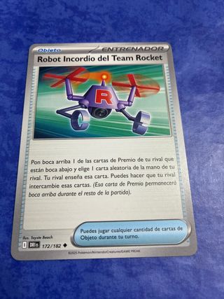 Carta de Pokémon del tipo Entrenador. - Nombre: Robot Incordio del Team Rocket. - Ilustrador: Toyste Beach. - Número de carta: 172/182. - Año de publicación: 2025.
