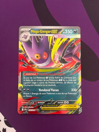 Carta de Pokémon Mega Gengar EX. Se envia tal cual está más protección. No negociable. - Habilidad: Ocultación Sombría. - Ataque: Vendaval Vacuo (230). - Debilidad: x2. - Resistencia. - Ilustrador: Taiga Kasai. - Número de carta: 269/217.
