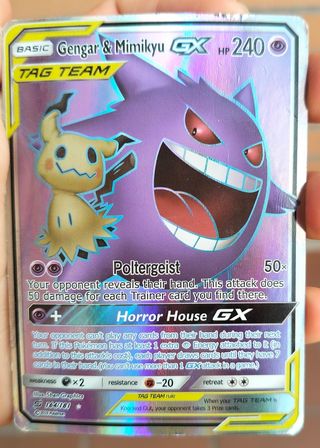 Carta Pokémon Gengar & Mimikyu GX TEAM TAG. - Básico. - PS 240. - Ataque: Duende (50 puntos de daño por cada carta de Entrenador). - Ataque GX: Horror House GX. - Debilidad x2. - Resistencia -20. - Retirada **. - Ilustrador: Mitsuhiro Arita. - Número: 038/095 RR.