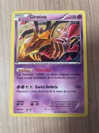 Carta de Pokémon de Giratina, edición básica. - Habilidad: Devoraluz. - Ataque: Garra Umbría (110). - Debilidad: x2. - Resistencia: -20. - Retirada: 2. - Ilustrador: 5ban Graphics. - Código: XY184. - Año: 2016.
