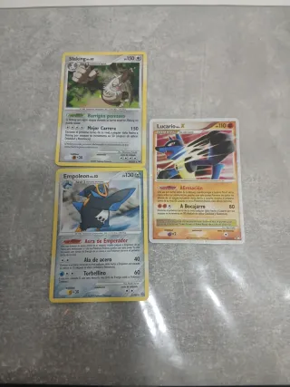 Escucho ofertas. Sellado o otras cartas o en dinero. Colección de cartas Pokémon vintage. - Carta Pokémon Slaking, Fase 1, con ataque Barrigón perezoso. - Carta Pokémon Empoleon, Fase 2, con ataque Aura de Emperador. - Carta Pokémon Lucario, EX, con ataque Afirmación. - Incluye información sobre los ataques y costes de energía de cada carta.