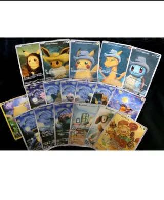 Conjunto de cartas Pokémon con un diseño único inspirado en las obras de Van Gogh. Tarjetas de fan art personalizadas .(No oficial) Cada carta presenta una ilustración detallada y artística. - Diseño exclusivo estilo Van Gogh. - Ilustraciones detalladas y coloridas. - Ideal para coleccionistas y amantes del arte. -La Mona Lisa de Pikachu -Retrato de eevee. -Retrato de Pikachu -Retrato de Charizard - Retrato de squirtle Cartas con un fondo de noche estrellada (mew, mewtwo, Charizard, Pikachu, lugia, Venusaur, snorlax) -Snorlax y smargle -Flora solar Total 18 cartas a 6€ unidad NO SE VENDEN SUELTAS SET COMPLETO)