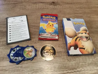 Pack de coleccionismo de Pokémon que incluye una caja metálica, varias cartas y un sobre de cartas sin abrir. - Caja metálica con diseño de Pokémon. - Varias cartas de Pokémon. - Sobre de cartas cerrado. -Dos cartas exclusivas, un Pikachu del McDonald's exclusivo del 2022 en perfecto estado Y un wheezing de galar Holo que está a 15 euros en transfermarket Y 252 cartas más