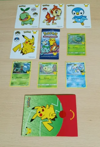 Lote de cartas Pokémon del 25 aniversario de McDonald's. - Carta Turtwig Holo. - Carta Froakie. - Carta Sobble. - Carta Totodile. Incluye las pegatinas, 4 cartas , caja Happy meal y el sobre abierto donde venían las cartas.