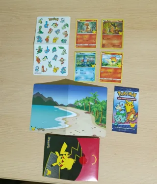 Colección de cartas Pokémon del 25 aniversario de McDonald's. - Carta de Bulbasaur Holo. - Carta de Chikorita. - Carta de Totodile. - Carta de Treecko. Incluye las pegatinas, la 4 cartas y el sobre abierto donde venían las cartas .