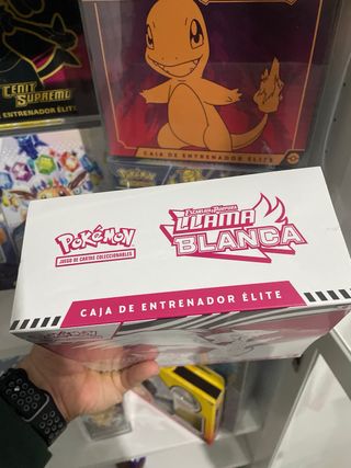 Caja de Entrenador Élite de la expansión Escarlata y Púrpura, con temática de Llama Blanca. - Contiene cartas coleccionables de Pokémon. - Incluye la ilustración de un Pokémon en blanco y negro sobre fondo rosa y negro.