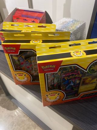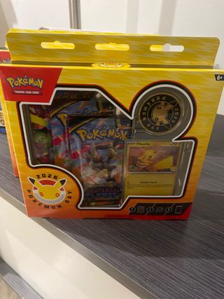 Caja coleccionista de Pokémon del Día de Pokémon 2026 en inglés. Contiene varios sobres de cartas y una moneda. - Sobres de cartas Pokémon. - Moneda coleccionable del Pokémon Day 2026 - Carta promocional de Pikachu. - Incluye 6+.