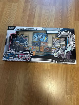 Colección Premium Unova Heavy Hitters de Pokémon.Scarlet and violet.Black Bolt& White Flare sin abrir.En 🇬🇧 ingles Contiene 6 packs black bolt, 6White flare,4 cartas promo Reshiram, Zekrom,Victimi and Zoroark y un promo tamañoXLde Kyurem, etiqueta:Pikachu, charizard,151,mega,mew