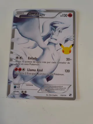 Carta Pokémon de Reshiram, edición 25 aniversario. - PV: 130 - Ataque: Llama Azul (120) - Habilidad: Enfado - Debilidad: x2 - Resistencia: Ninguna - Ilustrador: Shan Graphics - Número de carta: 113/114