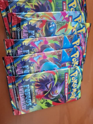 sobres de cartas Pokémon de la expansión Fuegos Fantasmales. 6€ la unidad - Cada sobre contiene 10 cartas de juego adicionales. - Ilustraciones de Pokémon como Gengar y otros. - Ideal para coleccionistas y jugadores.