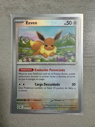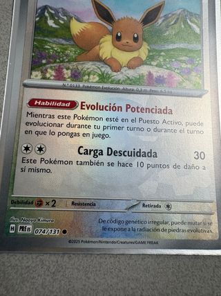 Carta de Eevee del Juego de Cartas Coleccionables Pokémon. - Carta básica. - Habilidad: Evolución Potenciada. - Ataque: Carga Descuidada (30 puntos de daño). - Debilidad: x2. - Resistencia: Ninguna. - Retirada: 1 energía. - Ilustrador: Naoyo Kimura. - Número de carta: 074/131.