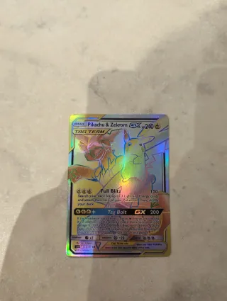 Carta Pokémon de Pikachu & Zekrom GX con 240 puntos de salud. - Ataque Full Blitz con coste de 3 energías. - Ataque Tag Bolt GX con coste de 3 energías y 20 de daño. - Valor de ataque: 200. - Valor de ataque especial: 150.
