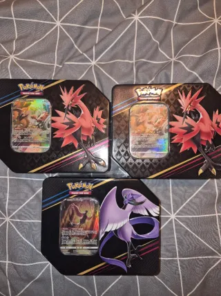 Se venden tres latas de colección de Pokémon. Las latas no tienen Sobres - Incluye dos latas con la carta de Zapdos. - Incluye una lata con la carta de Articuno. - Cartas de Pokémon TCG. Cada lata es 10€ prefiero trato en mano