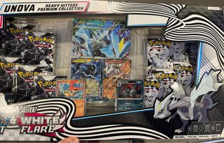 Colección Premium Pokémon Unova Heavy Hitters, completamente sellada y lista para añadir a tu colección. - Contiene 4 cartas de Pokémon V (incluye Kyurem V). - Incluye 1 carta promocional. - Incluye 12 sobres de Pokémon TCG. - Arte de Kyurem en la caja.